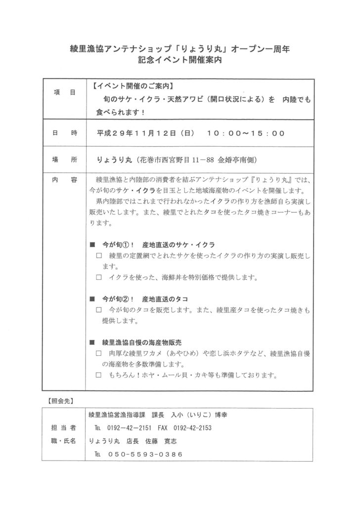 11月12日に花巻市の綾里漁協アンテナショップ「りょうり丸」にて、オープン一周年記念イベントを行います。今回は、今が旬のサケ・イクラを目玉とし、綾里海産物を多数準備しております。また、当日漁師がなかなか見ることがないイクラの実演販売いたします。時間は午前10時からになります。